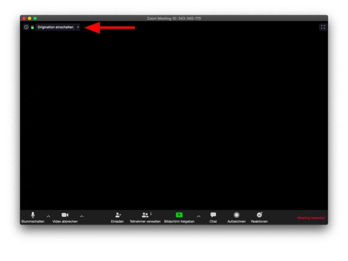 Im erweiterten Bedienfeld wählst du «Meeting-interne Option “Originalton aktivieren” vom Mikrofon anzeigen»